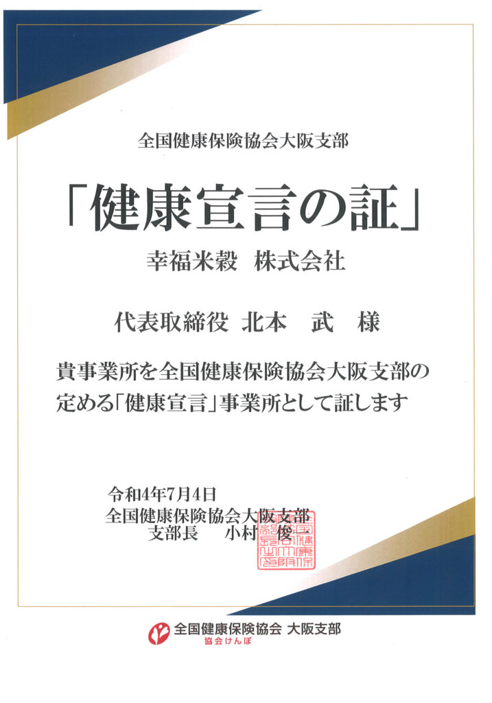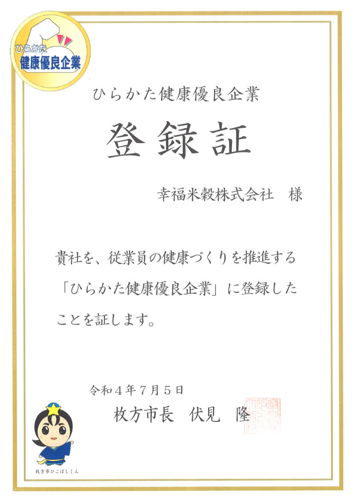 令和4年には「ひらかた健康優良企業」に登録、「健康宣言の証」を取得しています。